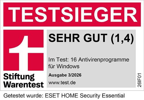 Die aktuelle Ausgabe 03/2026 der Stiftung Warentest liefert ein eindeutiges Ergebnis: ESET HOME Security Essential erreicht die Note 1,4 („sehr gut“) und setzt sich gegen 15 Konkurrenten durch. Besonders in Performance, Handhabung und Phishing-Schutz überzeugt die Lösung – bei gleichzeitig geringer Systembelastung. Obendrauf: ein integrierter, abgesicherter Browser für sensible Online-Aktivitäten.